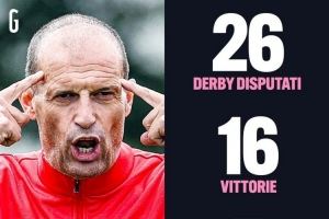 阿莱格里此前共26次带队出战米兰德比+都灵德比,战绩16胜5平5负